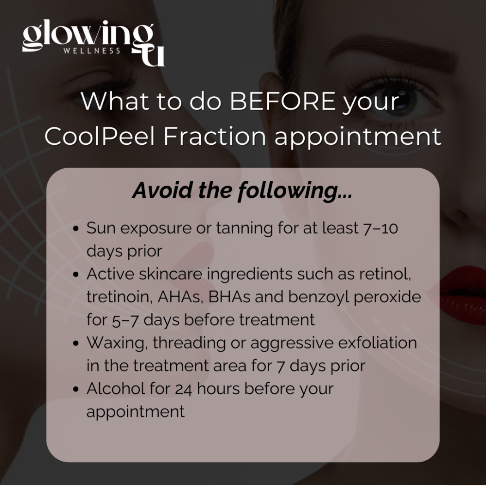 At Glowing U Wellness, CoolPeel® is delivered as a complete skin renewal experience: before, during, and after treatment.